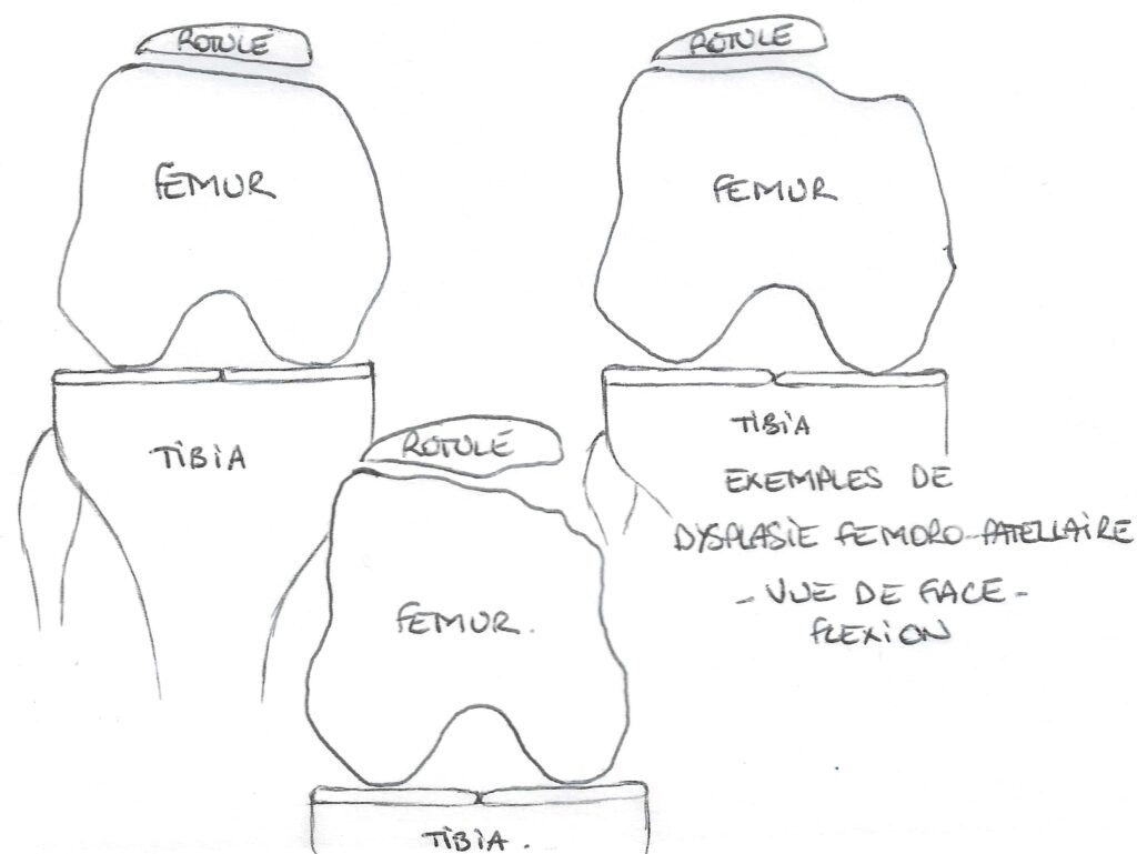 Une dysplasie fémoro-patellaire est une mauvaise congruence de la trochlée fémorale. Le bas du fémur à « un trou » pour accueillir le derrière bombé de la rotule. Lorsque cette concavité n’est pas assez profonde, la rotule est moins bien tenue.